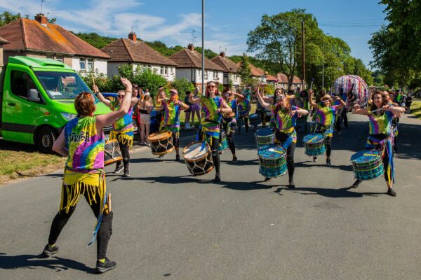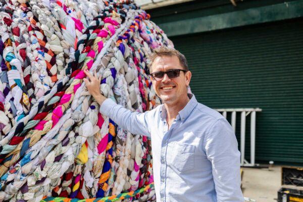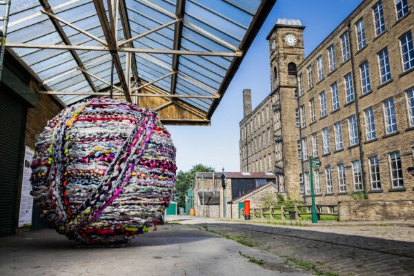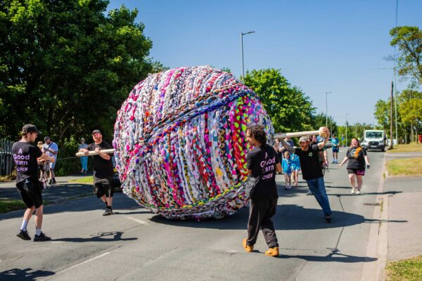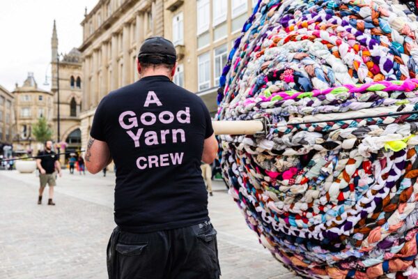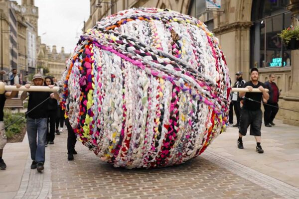 A Good Yarn was quite the sight – a gigantic yarn ball, three metres high and wide. It was created in May and June 2025 by 2,500 residents of BD10, who plaited vast quantities of found and donated fabric into a kilometre-long rope and then wound it into a ball. Following rolls through the streets of BD10 and the city centre in July 2025, the yarn ball went on display at Bradford Industrial Museum.