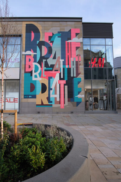 The mural occupies a full-height wall at The Broadway shopping centre, where its scale and rhythm hold space within the urban environment. Its direct language speaks to everyone who encounters it, encouraging a shared moment of calm in the heart of Bradford.