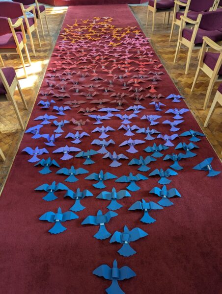 Members of the Anchor Project, based in St. Clement’s Church, Barkerend, worked with artist Katie Jones to create a hanging installation in the roof space of the Church. This colourful work was made from 100s of paper birds, with each bird containing a piece of paper with words written on it, contributed by a member of the local community.