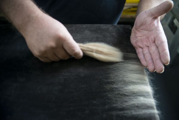 I examine the sample by hand, to get a good feel of what the sample is going to be. First of all, you look at color because colour is a big indication on whether the animal has been well treated. Then you look at fibre strength, whether the animal has had a good diet, it should have a protein inside called keratin. If it loses that keratin it’ll have a weak point, which is no good because when you twist and spin, you’ll get fibre breakage. You’ll then do a length test. So when we’ve got a scoured sample of camel hair and we comb it, we’ll know roughly what percentage of top (the longer fibres) we’ll get out which goes to spinning and what percentage of noil (the shorter fibres) we’re going to get out, which then goes for another process.
